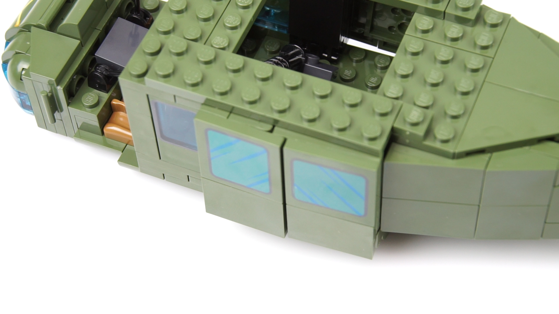 Now we can see the entire fuselage, even if the actual tail rotor is still missing. Before it is your turn, we first build the two sliding doors. The hinge in the middle allows the doors to snap and adapt to the shape of the helicopter. At the same time, locking is also possible. Time to shoot the rump and build the roof.