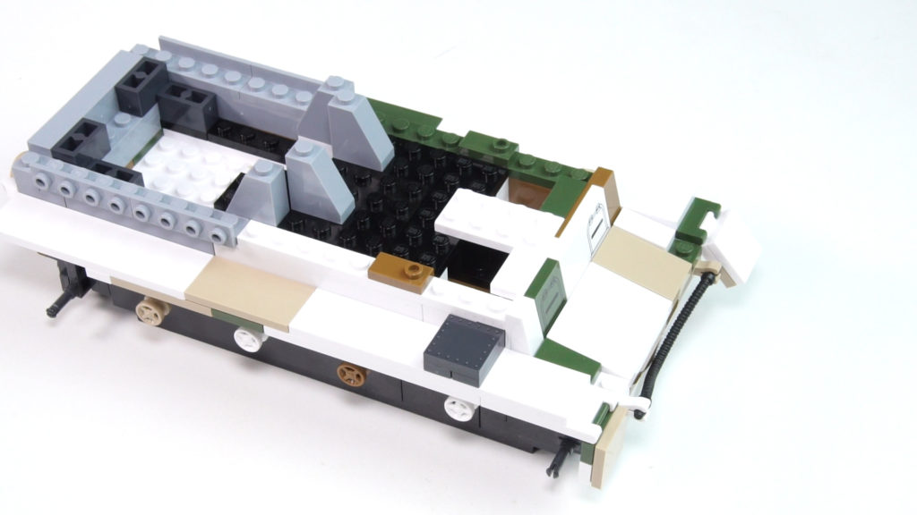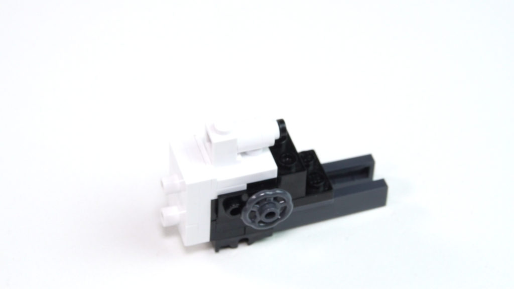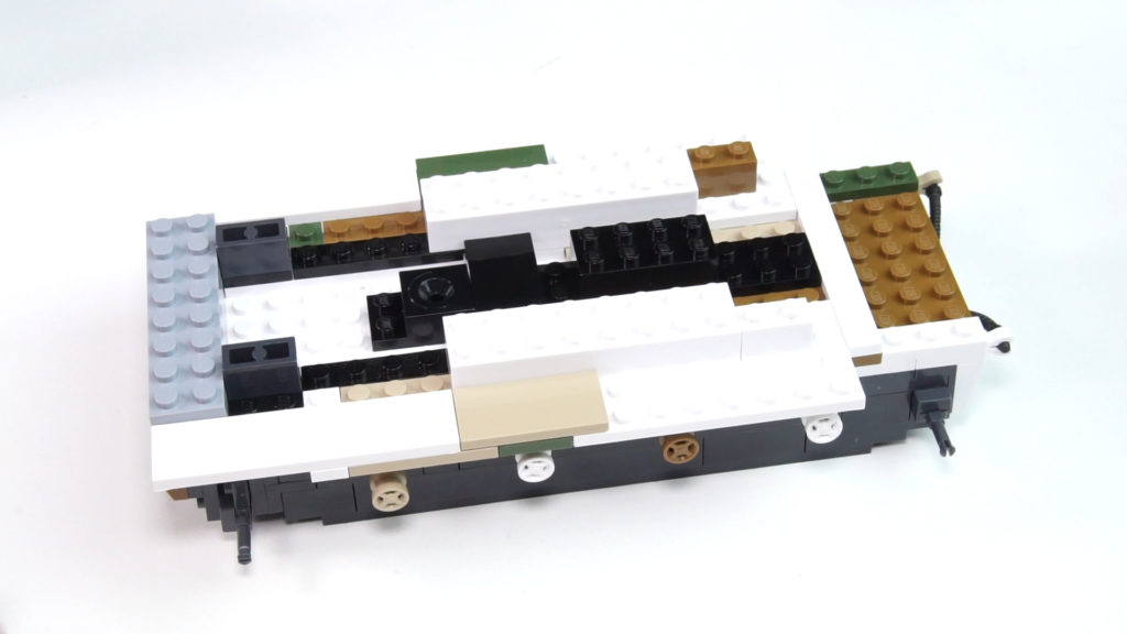 The construction begins with the basic structure of the hull in beautiful anthracite. Some would also say Dark Blueish Gray. After a series of bricks and plates, the first small casters / guide rollers come to the model. Then we start with the beautiful winter camouflage. For the camera, of course, the white is deadly and I had to play with the bezel a little to get a good compromise between the white background and the white blocks.