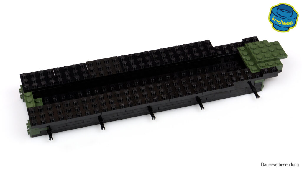 Building the hull doesn’t start with large plates, as you might expect from a large model like the TOG 2. Instead, numerous 2×7 plates are used, which are reinforced from above with large bricks. After the second layer, brackets and plates modified to reverse the direction of construction are installed. These are necessary because the entire armor is built in separate construction steps and then attached to the side.