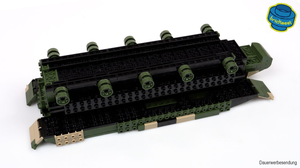 Next up is the side armor. This consists of two larger constructions in which the camouflage pattern is achieved by colored tiles. After they have been installed, large printed tiles are placed on top. The next construction steps ensure outstanding running and drive rollers. We put the 4 individual attachments at the front and rear.