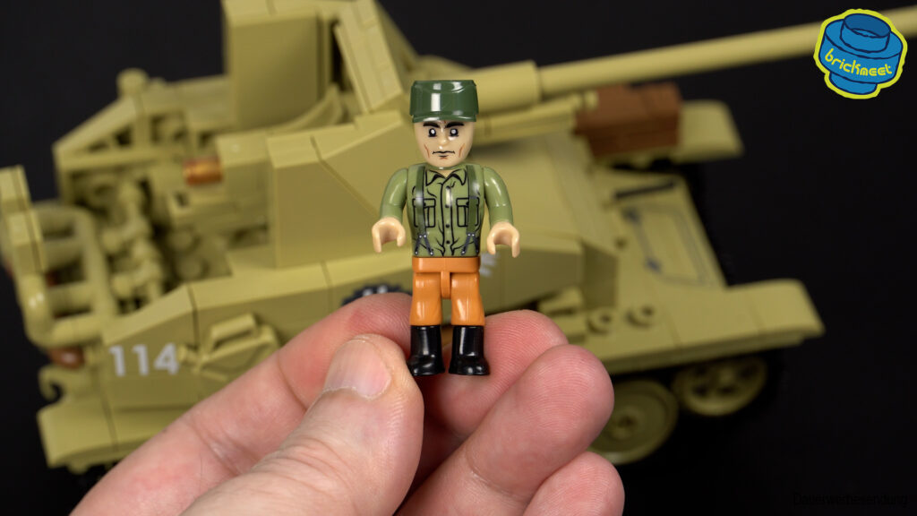 The smallest tracks that COBI has to offer are used for the chains. They don’t run at all on my acrylic board. But if you take some paper as a background, that changes completely. There they run almost as smoothly as butter and hardly need any pressure from above. Of course, this tank destroyer does not have a turret. Instead, side armor is built that includes a moveable opening for the gun barrel. Finally, a minifigure is built. There are no other accessories. A small nameplate, like you get on almost all models, would have been nice.