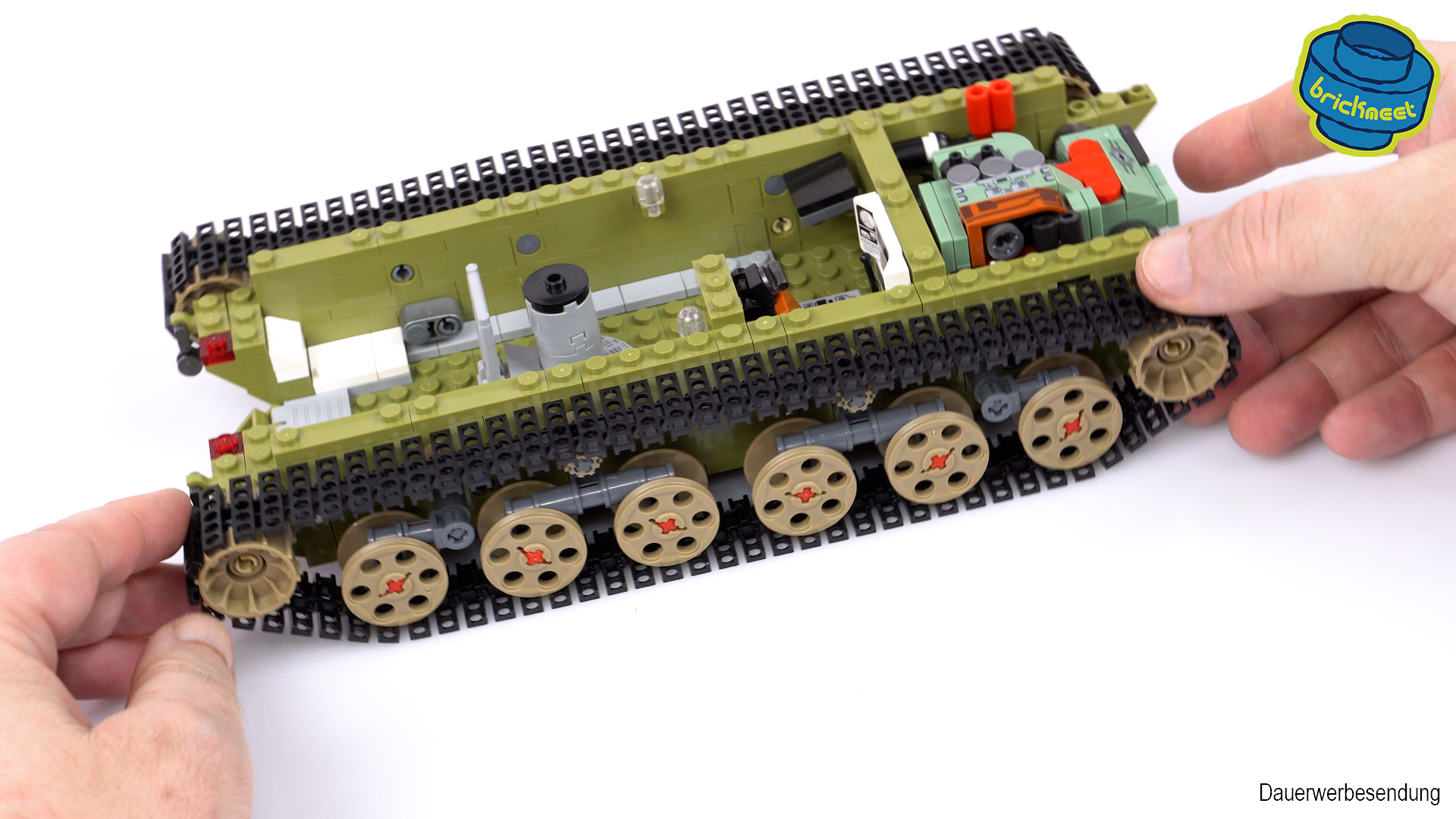 The engine is completely built and looks really nice. Unfortunately, one of the oxygen bottles was damaged, so I had to look for a replacement. However, I didn’t have any in red and therefore had to switch to black. But that was the only missing part in the whole set. The rollers are suspended in a swinging manner, so that they come very close to a suspension. The chains on this model run absolutely brilliantly, no matter what the surface. For the side armor, which will be added later, we now use red Plate Modified, the color of which is rather unsuitable.