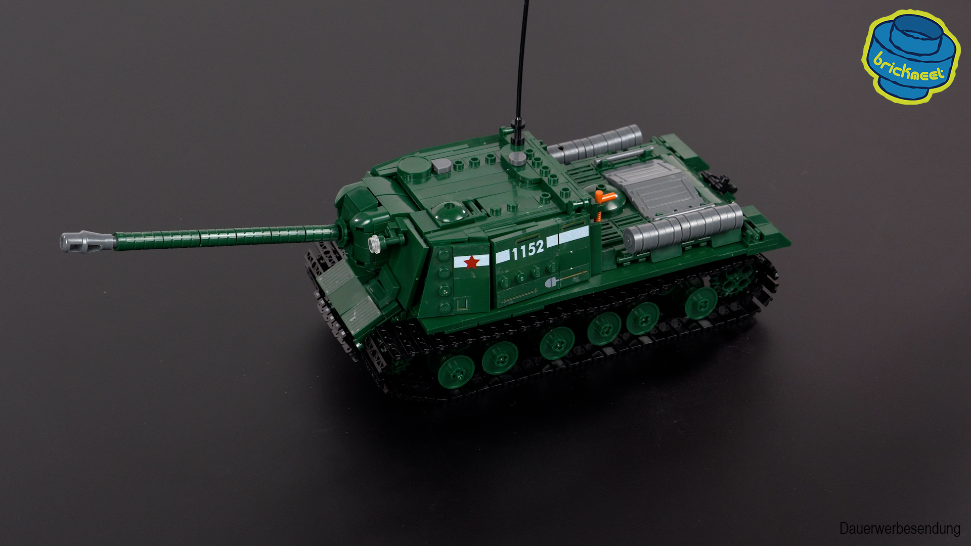 After some separately built parts like the rear and the front, the hull is completely tiled and we can devote ourselves to the turret. This consists of a base made from a reversal of construction direction, to which the armor is then attached all around. This is shaped by several ball joints. Finally, 3 figures and a little decoration have to be built.